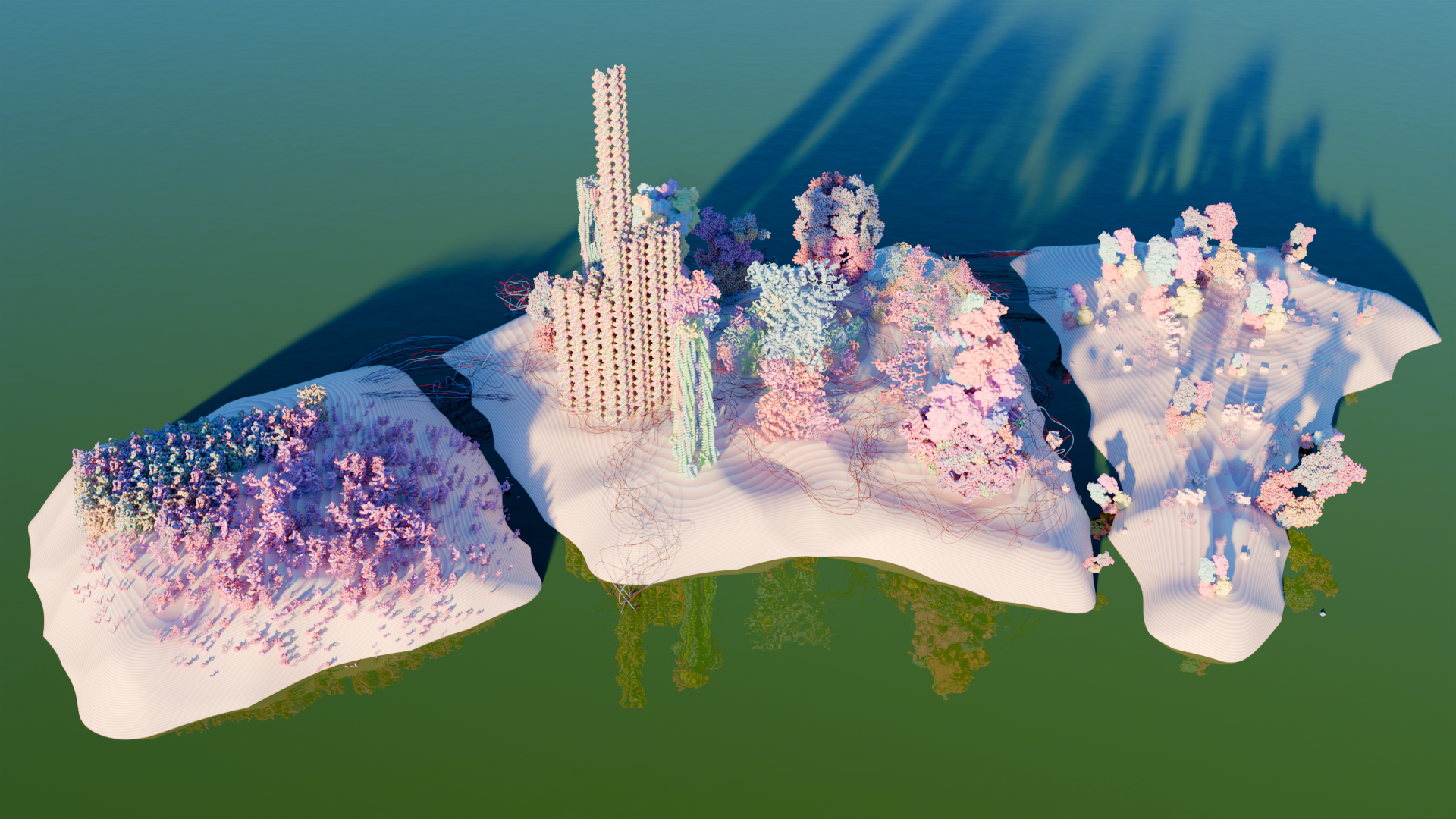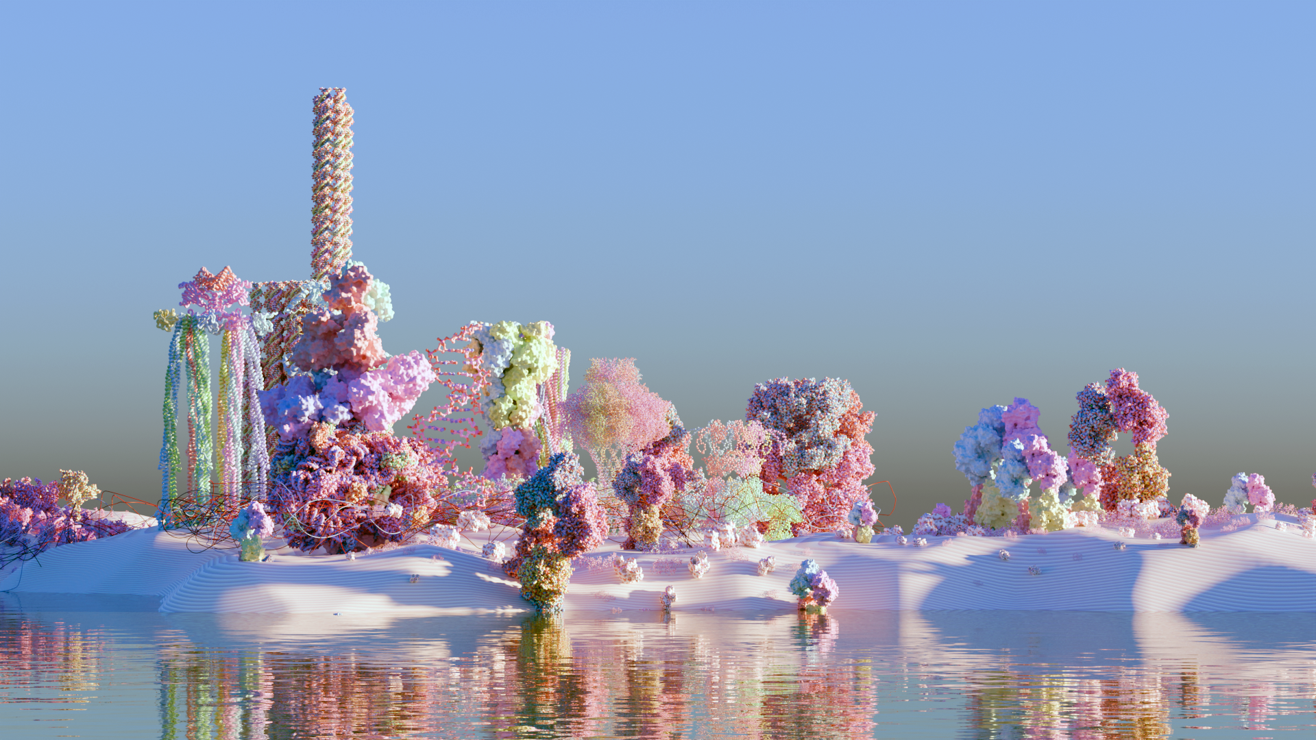 Ландшафт — это не только видимая поверхность, но и структура, скрытая на уровне молекул. Белки — архитекторы жизни, и их формы рифмуются с формами природных или урбанистических пространств. Город — продолжение биологии, мегаполис — фрактал клетки. Мы строим города так же, как природа строит белки. Архитектура и химия следуют одним паттернам.