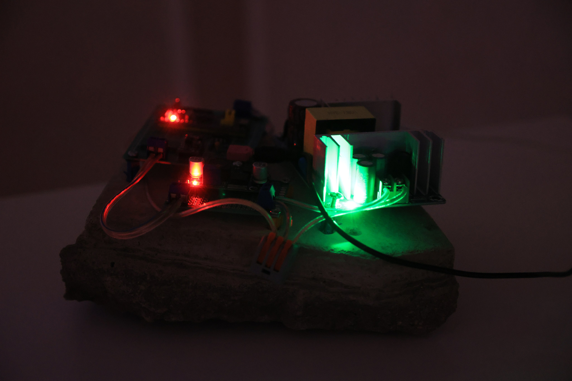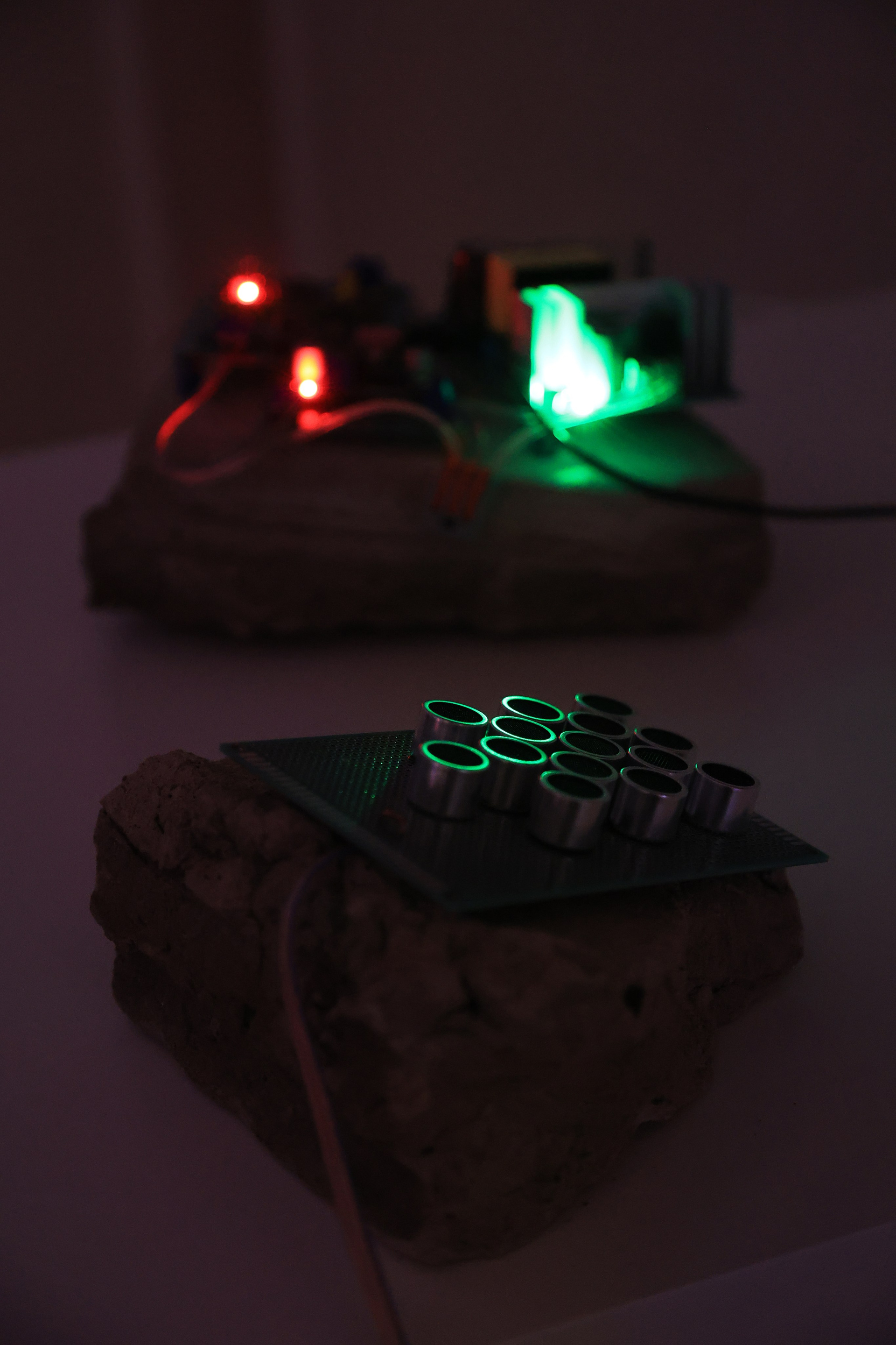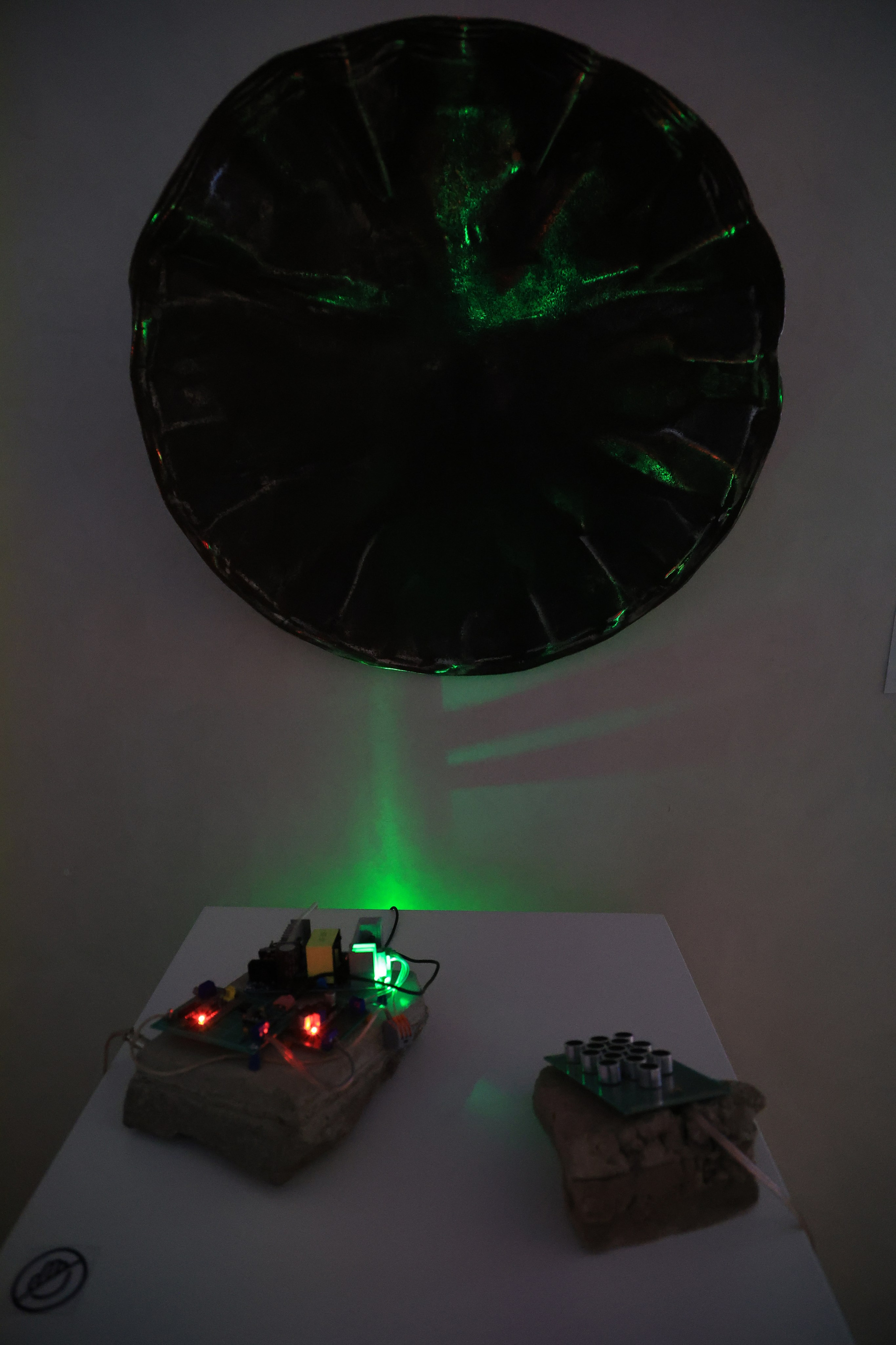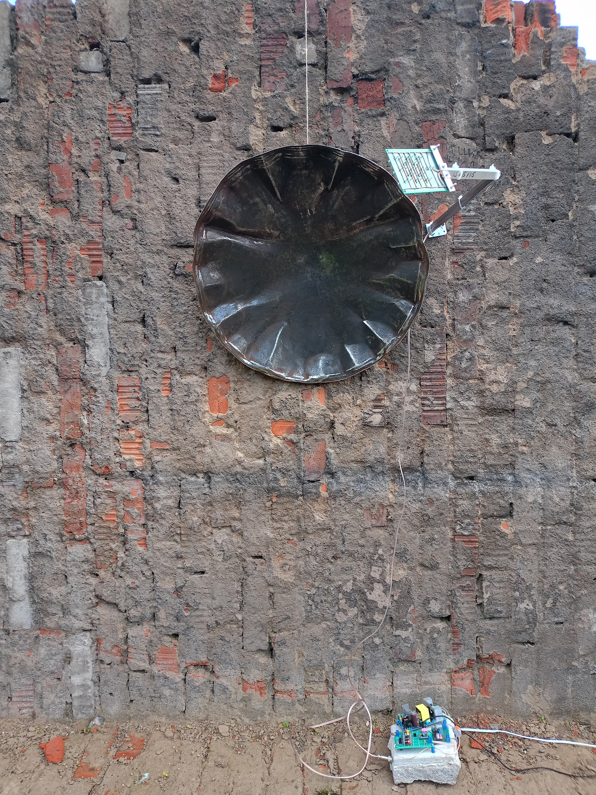 Инсталляция переносит это ощущение в физическое пространство. Звуковой луч направлен на большую ржавую металлическую тарелку. Объект не объясняет себя и не имеет функции — он просто есть.